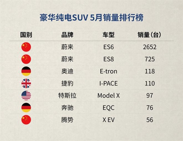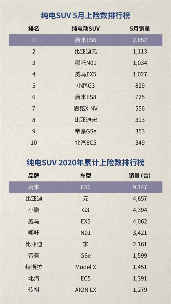 6月10日,中国汽车技术研究中心公布了2020年5月国内车市上险数据。数据显示,蔚来ES6五月上险数为2652台,居豪华中型SUV第八名。截至5月,ES6累计上险数已突破2万台,达20637台,蔚来ES6已连续9个月蝉联中国豪华电动SUV销冠。
