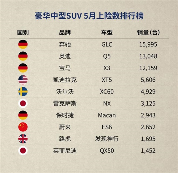 豪华中大型SUV方面,雷克萨斯RX、奔驰GLE、凯迪拉克XT6位列前三;豪华中型SUV,依然是德系三强,奔驰GLC、奥迪Q5L以及宝马X3。