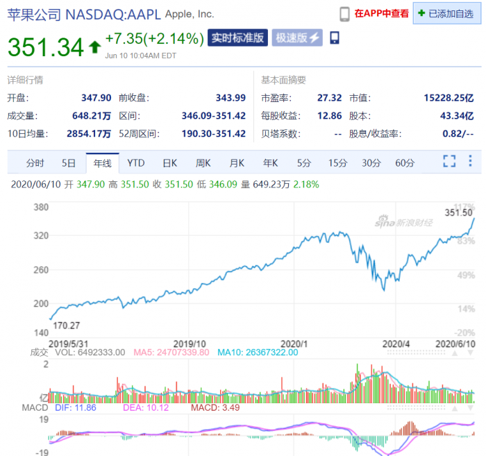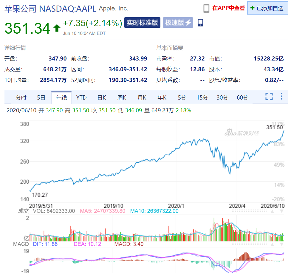 北京时间6月10日晚,美股开盘后,苹果股价持续走高,现已突破350美元,市值也历史性地突破1.5万亿美元!苹果今日开盘价347.90美元,至截稿时涨至351.34美元,涨幅2.14%,对应市值15228.25亿美元,市盈率27.32%,而且还有继续上涨的趋势。