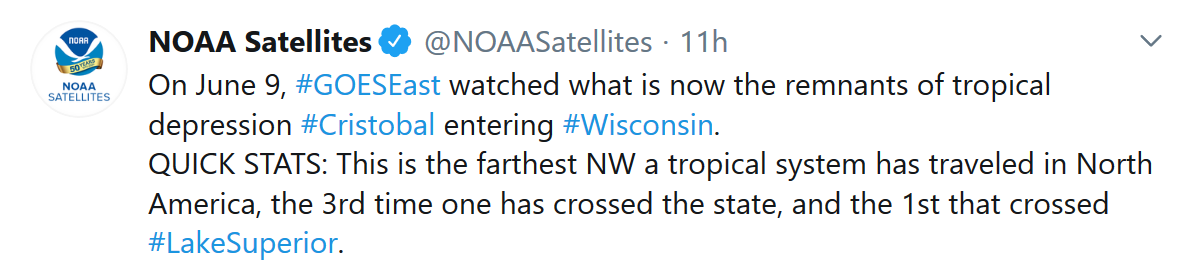 当地时间周三,美国国家海洋和大气管理局(NOAA)的卫星团队在Twitter上引用了一些Cristobal的历史记录,称这是在北美走过最西北地方的一个热带系统。另外,它还是第三个穿越威斯康星州的类似系统,同时也是第一个记录在案的穿越苏必利尔湖的系统。