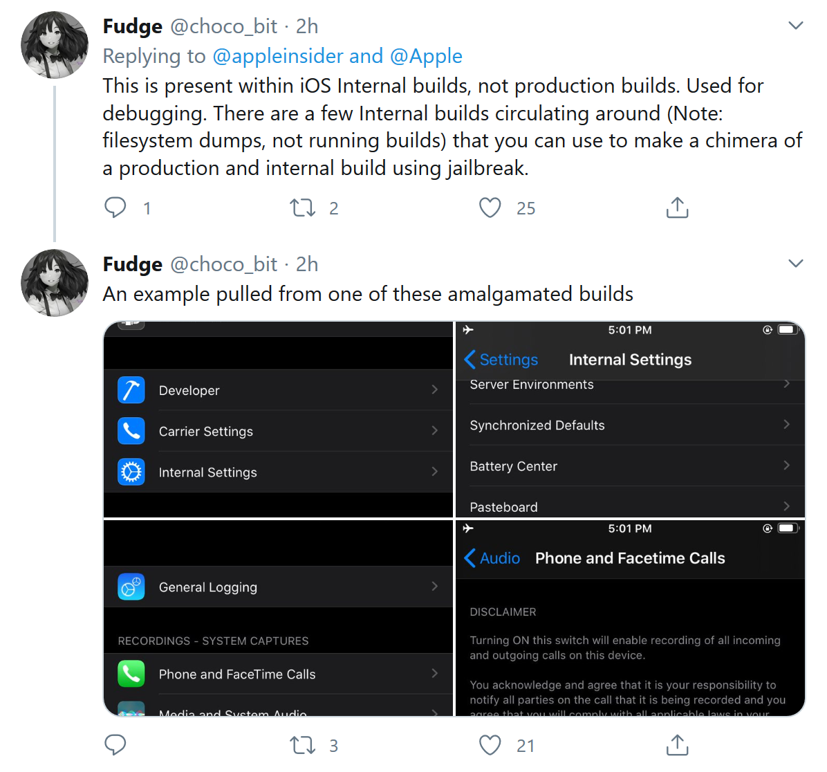 AppleInsider表示其无法证实这张图片的真实性,不过从截图的某些方面来看,它可能是伪造的。比如里面出现的“FaceTime”中的字母“t”没有像它应该的那样大写。此外,设置面板中的文本不一致,在调用特性recording(录音)和audio logging(音频日志)之间切换。另一方面,苹果在系统文本中对新功能的命名非常特别。