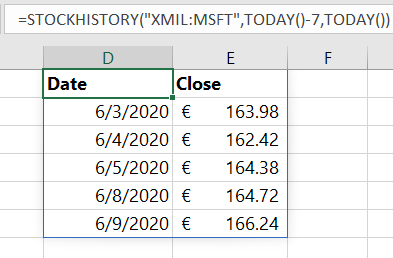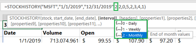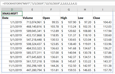 此外还可以添加五个属性来选择要包含哪些信息,如日期、开盘或收盘值、最高价、最低价和成交量。目前STOCKHISTORY功能已经面向 Microsoft 365 的 Beta 频道用户开放,未来应该会向所有用户开放。