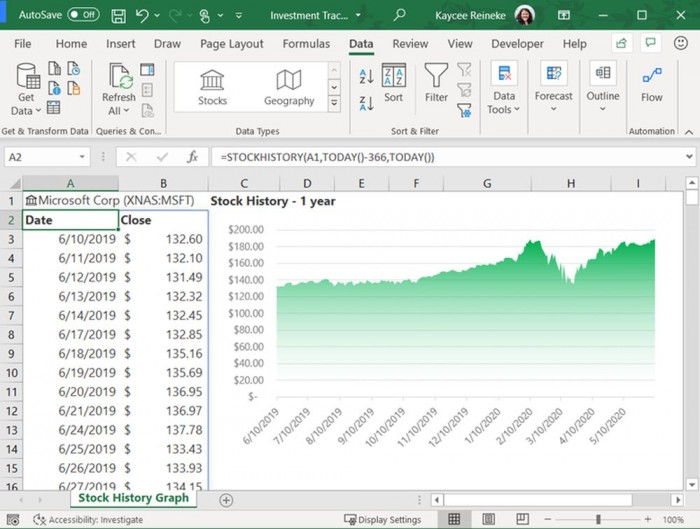 Microsoft Excel 近日获得了一项新功能:帮助用户更直观的了解一家公司在某个时间段内的历史股价变化情况。这款新函数称之为“STOCKHISTORY”,在 Stocks 数据类型基础上整合动态数组功能,能够抓取不同时间段内的股价变动情况并将其完整列出。