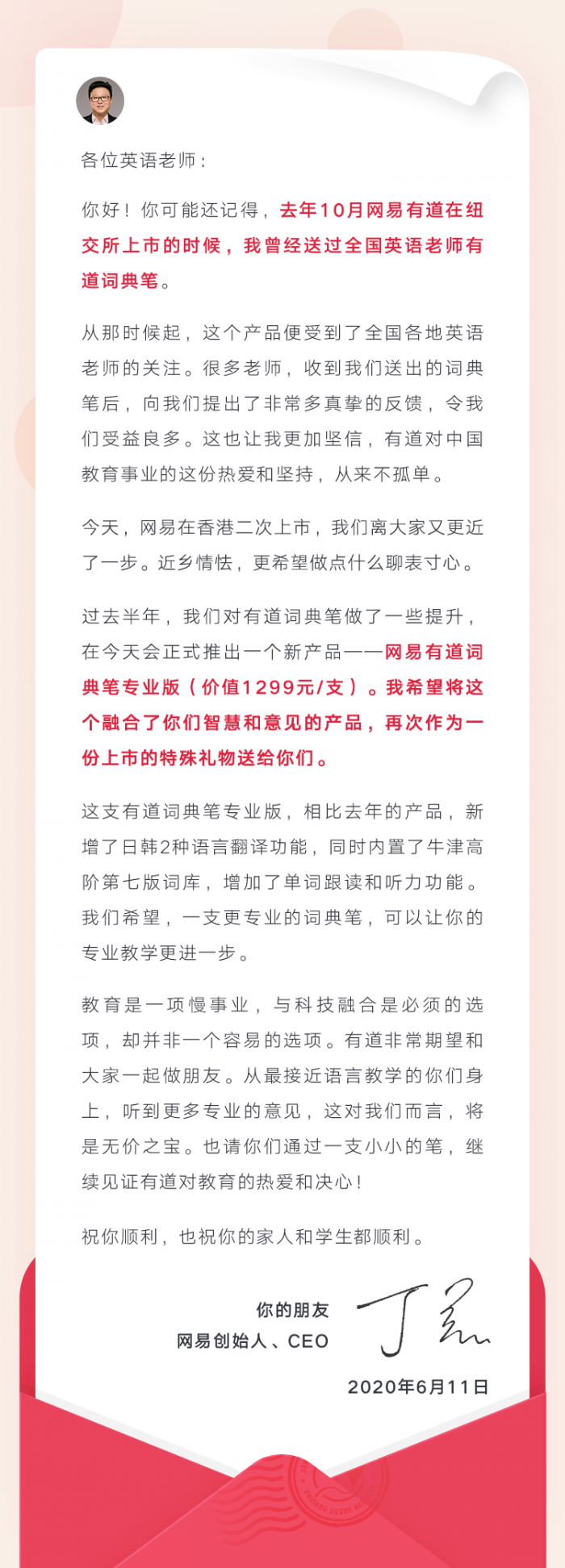 丁磊表示,在香港二次上市让网易离用户更近一步,而“近乡情怯”,他希望通过这份特殊的礼物“聊表寸心”。去年10月底,在网易有道上市之时,丁磊曾向全国的英语老师免费赠送过一次有道词典笔,受到了来自中小学、高校老师的热烈欢迎,也收到了老师们提出的众多反馈。丁磊认为,用户的热情也让他更加坚信,网易有道对中国教育事业的这份热爱和坚持并不孤单。