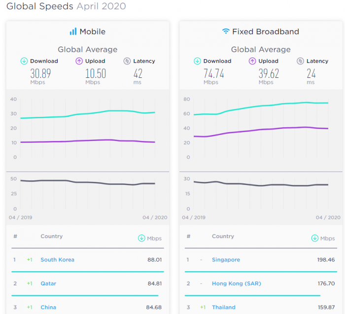 近日,世界知名网络测速软件Speedtest公布了截至2020年4月全球固定宽带和移动网络网速最快国家和地区的指数,中国移动网络速度在全球排名第三位。其中固定宽带网速排名前十的国家和地区包括四个东南亚国家和六个欧洲国家,美国则跌至第十一名。新加坡和香港地区保持排名不变,依然位列固定宽带网速前两名。