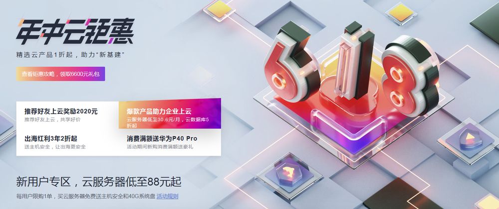 每年年中的6·18和年底双11大促活动是商家促销活动最为密集的时候,而且优惠力度都非常大。如果你近期有购买云产品的意向,那么华为启动的“年中云钜惠”活动无疑是绝佳的购买时机。无论是新老用户,都有折扣力度非常给力的产品供你选择,例如推荐好友上云奖励 2020元,出海红利3年2折起,消费满额送华为 P40 Pro,新用户云服务器低至88元起。