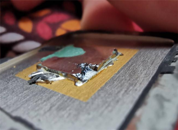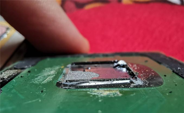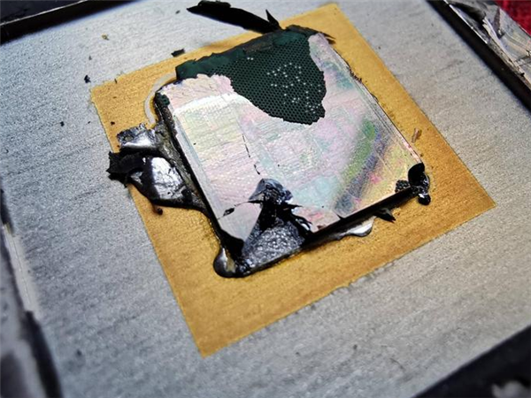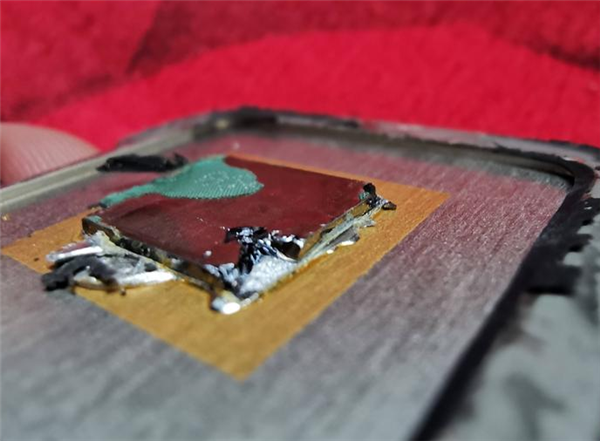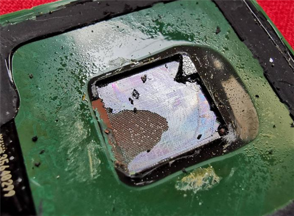 不过他开盖的过程可以说简单粗暴,直接用刀子撬外壳了,四周的环氧树脂胶倒是很轻松撬开,但是他忘了奔腾处理器是钎焊的,结果大力出奇迹,CPU核心也被破坏了。