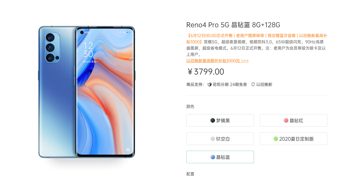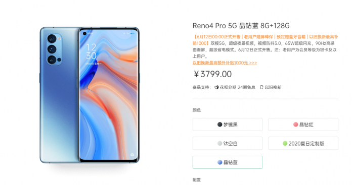 核心配置上,Reno4 Pro采用6.5英寸AMOLED显示屏,分辨率为2400×1080,搭载高通骁龙765G移动平台,前置3200万像素,后置4800万+1200万+1300万超清激光对焦三摄系统,电池容量为4000mAh,支持65W闪充。