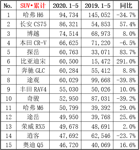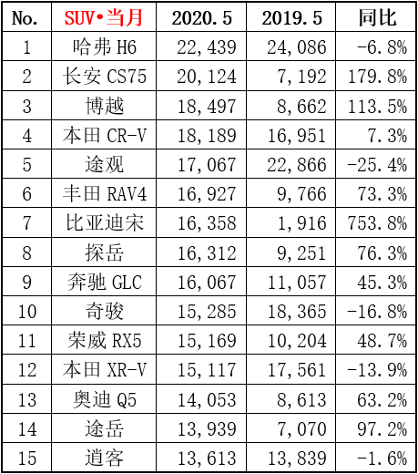 以下为5月、1-5月国内SUV销量排名: