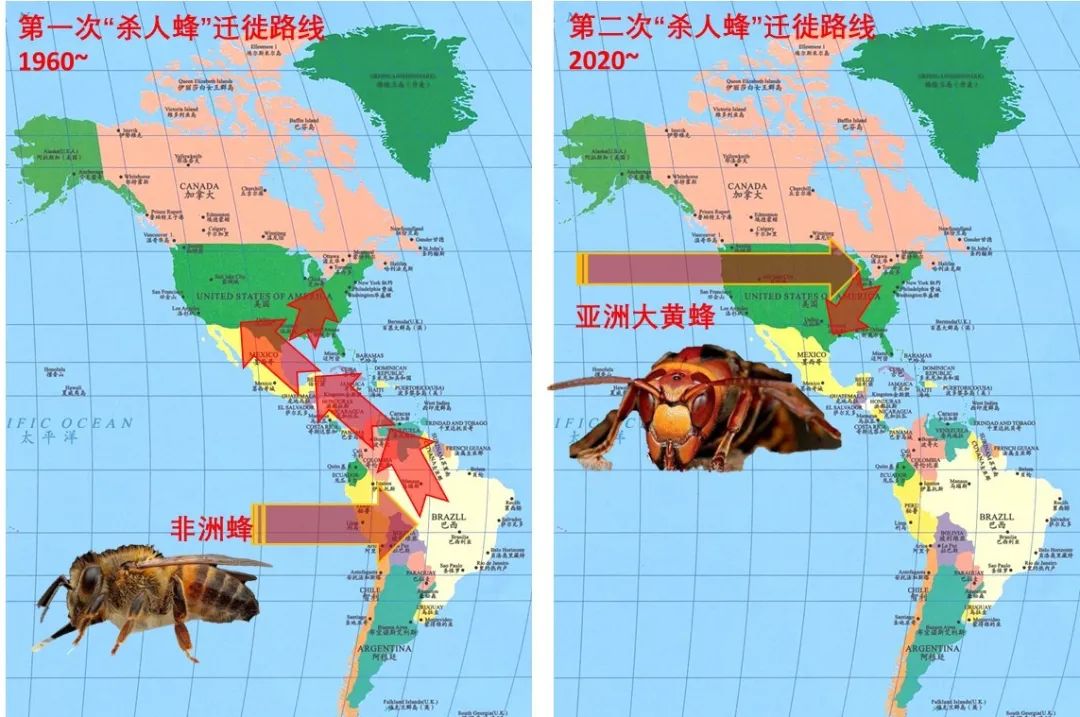 美洲两次“杀人蜂”的迁徙路线,第一次来自非洲(左),第二次来自亚洲(右) | 作者整理
