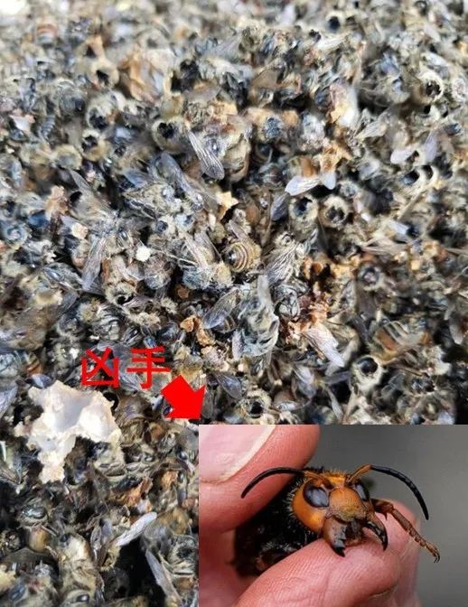 胡蜂家族中的“绝顶杀手”虎头蜂(背后为作案现场)。它们会使用尖尖的上颌撕裂蜜蜂,并且猎杀十分积极,每分钟最快可咬下40只蜜蜂头部,单单几只大虎头蜂同时进攻一个蜂巢,即可造成惨重伤亡。|作者整理
