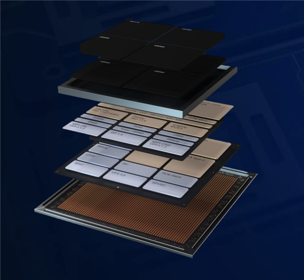 Lakefield内部可分为四层结构,其中顶层是PoP整合封装的LPDDR4X内存,最大容量8GB,最高频率4267MHz;第二层是P1274 10nm工艺制造的计算层,内部包括CPU核心、GPU核心、显示引擎、缓存、内存控制器、图像处理单元(IPU)等;第三层是P1222 22nm工艺制造的基底层,内部包括I/O输入输出单元、安全模块、ISH、EClite等,成本低,漏电率低;最下方则是封装层。