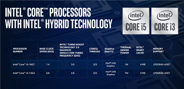 Lakefield家族有两款型号,均为五核心,其一为酷睿i5-L16G7,CPU部分基准频率1.4GHz,全核睿频最高1.8GHz,单核睿频最高3.0GHz,UHD核显部分集成64个执行单元,频率500MHz,热设计功耗为7W。