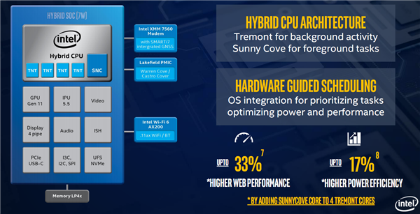 CPU核心包括一个Sunny Cove架构的大核心(Ice Lake家族同款),四个Tremont架构的小核心(Atom家族同款),分别负责前台、后台任务,并设计了专门的硬件调度机制,整合在操作系统内,并支持支持CPU和操作系统调度程序之间实时通信,从而在正确的内核上运行最合适的负载,优化性能和能效。