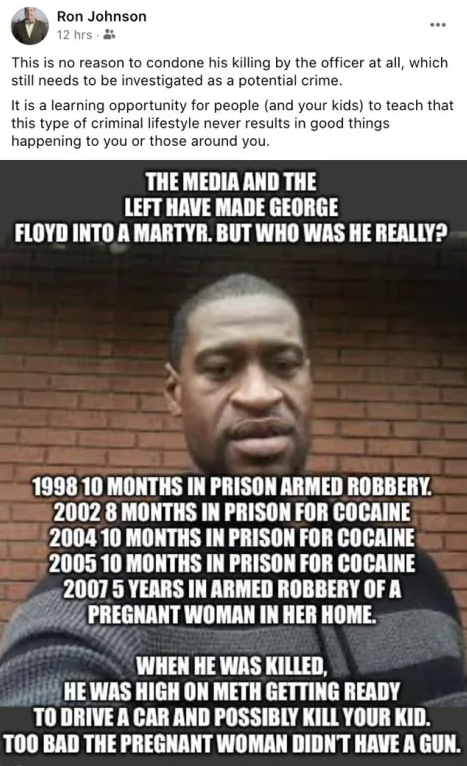这名高管是拳头消费者产品部全球总经理Ron Johnson,他近期在FB上说:“媒体和左派已经把George Floyd描绘成了一个烈士,但他真正是谁呢?”随后,Johnson分享了一张图片,列举了George Floyd生前的种种犯罪记录。
