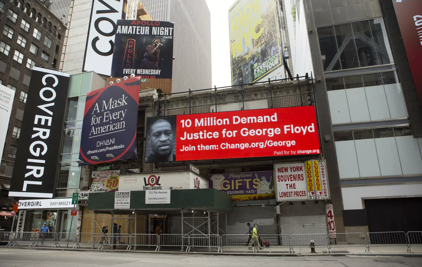 这些批评源于Change.org的 "筹款加入 "功能,这似乎让一些组织者感到意外。一旦用户在请愿书上添加了自己的名字,就会被邀请筹款,以资助该活动的进一步推广。对于弗洛伊德的请愿活动,按照Change.org上的显示,有超过50万人集资。这笔钱资助了纽约市和明尼阿波利斯市的100多块广告牌,每块广告牌上都展示了弗洛伊德的照片和指向请愿书的链接。