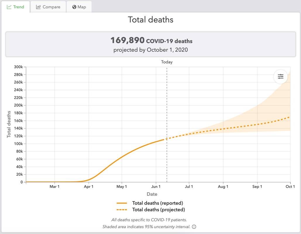 Jha的估算几乎跟另一种用于模拟新冠病毒影响的工具一致。本周早些时候,该工具将对10月1日COVID-19死亡人数的预测修正为超过19.3万人。建模工具现在显示,等到10月1日,将有近17万美国人死于COVID-19: