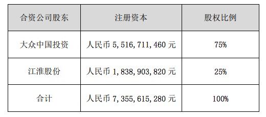 公告显示,交易正式完成后大众汽车集团与安徽省国资委将分别持有安徽江淮汽车集团控股有限公司50%的股权,同时大众汽车集团和江淮汽车有意认购合资公司江淮大众发行的新股权,完成认购后江淮大众的注册资本将增加至约73.56亿元,大众汽车集团将持有江淮大众75%的股权。