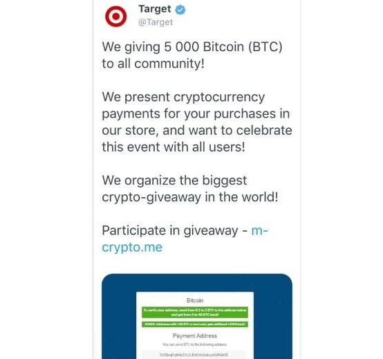 但中招的可不止马斯克一个,据外媒报道,此前美国零售业巨头 Target 的官方推特账户也遭到了劫持,黑客对其近 200 万粉丝发出诈骗链接,称用户向其发送一笔加密货币,就有机会赢取 5000 枚比特币的赠品。
