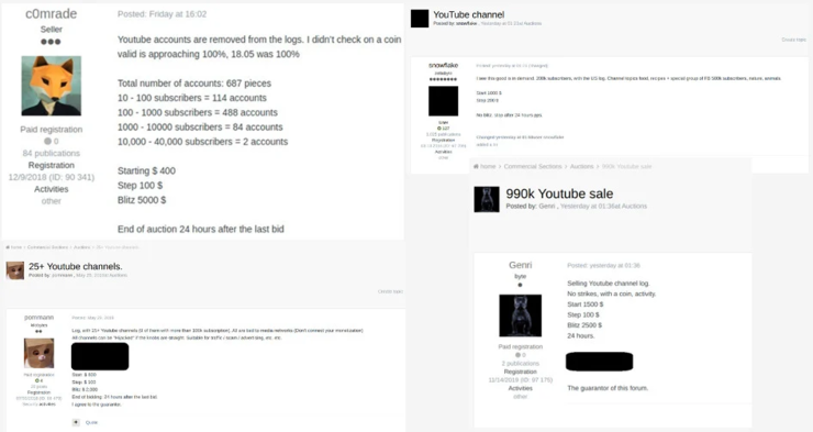 再比如黑客论坛上拍卖 99 万个 YouTube 活跃频道的日志,起价1500美元;687 个 YouTube 账户,按用户数细分,起价为 400 美元。