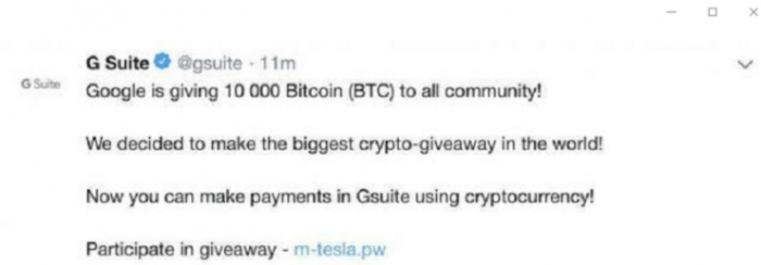 同样,黑客曾经还盗用谷歌在推特上的 G Suite 官方账号,向 80 多万粉丝表示,将开展世界上最丰厚的加密货币赠品活动,赠送粉丝 1 万枚比特币,前提是粉丝需要先向其提供的地址转入 0.1 到 2 枚比特币,以验证地址,并声称转得越多,回报越高。