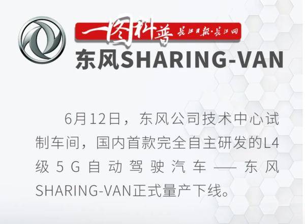 6月12日,东风公司技术中心试制车间,国内首款完全自主研发的L4级5G自动驾驶汽车——东风Sharing-VAN正式量产下线。下线后,首批共6辆Sharing-VAN将驶向位于山东省青岛市的国家海洋实验室,在智能园区进行载人摆渡、运送物品等运营活动。东风Sharing-VAN,这一代表目前国内最高水平、使用5G通信技术的自动驾驶汽车,在中国车都实现了产业化,并开始商业化营运。