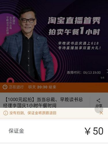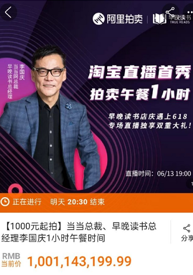 6月12日,阿里拍卖数据显示,李国庆午餐拍卖价格超过10亿元,涨至1000316599.99元。对此,李国庆回应:由于发现有用户恶意抬价,午餐一小时将重拍。李国庆表示,”天价午餐不是我的本意。“