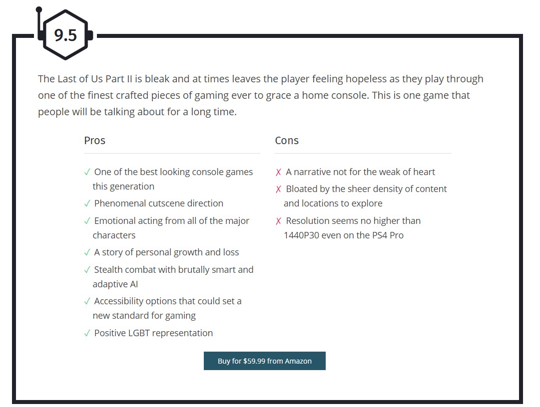 《最后的生还者2》与前作对比有过之而无不及,在几乎所有方面都取得了长足的进步,艾莉更加步入了玩家们的焦点之中,以一种故事高潮的方式讲述了这部续作。这也让顽皮狗的剧情讲述能力从PS3上的《神秘海域》以来变得更加难忘。《最后的生还者2》在潜行和动作的基础玩法上,讲述了一个层次分明、情感震撼的故事,同时改善了前作的游戏机制,把更多《神海》的玩法整合了进来。