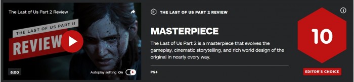 今日(6月12日),《最后的生还者2》媒体评分解禁,IGN为其打出10分,赞其为大师之作,Gamespot打出8分。IGN表示,《最后的生还者2》是一部大师之作,游戏性更进一步,拥有前作的电影化叙事和丰富游戏世界设计。
