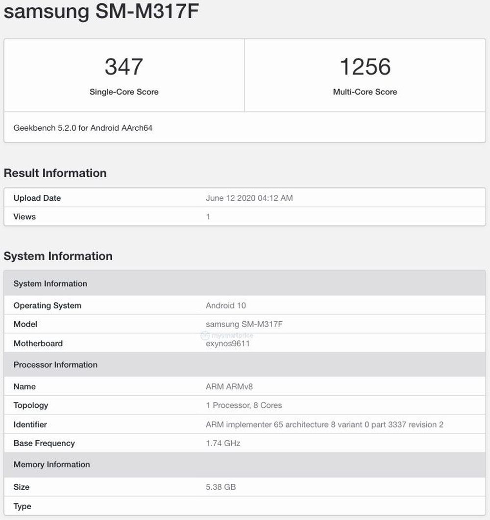 在 Galaxy M51 现身之后,今天 Galaxy M31s 也出现在 GeekBench 跑分库中。该机型号为SM-M317F,单核成绩为 347 分,多核成绩为 1256 分,预装 Android 10 系统,配三星自家 Exynos 9611 处理器,6GB的内存。