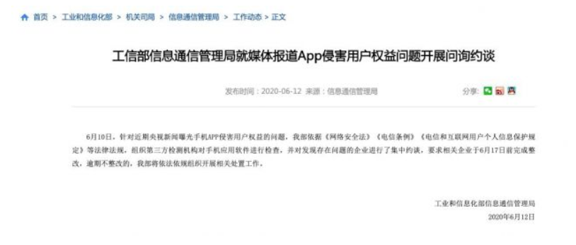 6月12日消息,据工信部官网发布的消息,6月10日,针对近期央视新闻曝光手机APP侵害用户权益的问题,我部依据《网络安全法》《电信条例》《电信和互联网用户个人信息保护规定》等法律法规,组织第三方检测机构对手机应用软件进行检查,并对发现存在问题的企业进行了集中约谈,要求相关企业于6月17日前完成整改。