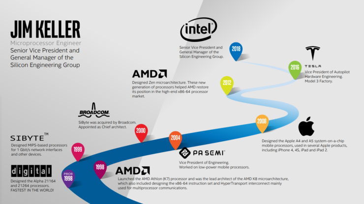 2012年,Keller再次加入AMD开发高性能和低功耗的处理器内核,领导Zen架构的开发。同第一次离开AMD一样,在基于Zen架构的芯片正式推出之前,Keller又选择了离开,继而转入特斯拉研究汽车芯片,助力特斯拉推出远超GPU的AI芯片。