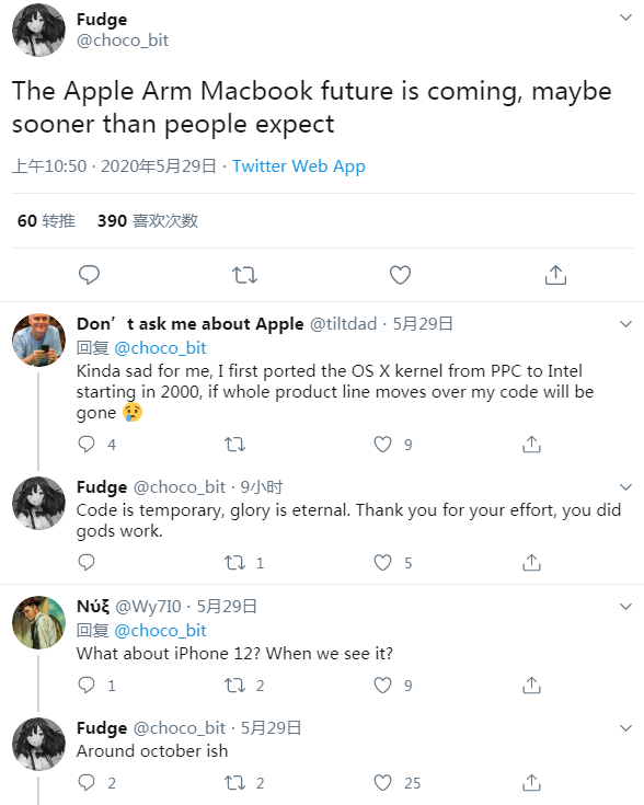 知名爆料人 Fudge(@choco_bit)今日在 Twitter 上表示,苹果或很快推出使用 ARM 处理器的 Mac 产品线。此外他与网友探讨了有关新机的一些细节想法,包括应用程序、Boot Camp 和其它功能将受到怎样的影响。报道称苹果多年来一直在稳步推进 ARM 版 Mac,相关爆料可追溯到 2016 年的 MacBook Pro 机型中内嵌的 T1 协处理器(后继续升级到 T2)。