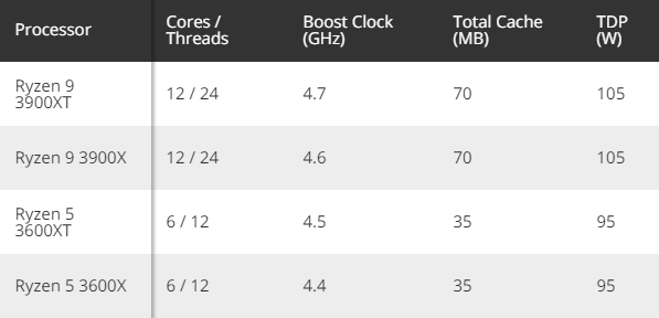 参数方面,3900XT的加速频率从3900的4.6GHz提高到4.7GHz,3600XT的加速频率从4.4GHz提高到4.5GHz。