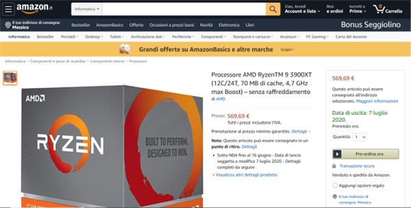 多次出现于爆料中的AMD锐龙3000XT系列处理器,被进一步实锤。亚马逊意大利将AMD Ryzen 9 3900XT和Ryzen 5 3600XT两款处理器上架,定价分别是569.69欧元(约合4539元)和284.84欧元(约合2269元),当然,欧洲的价格相较于国行,参考意义并不大,当前3900X和3600X分别1499元和3399元。