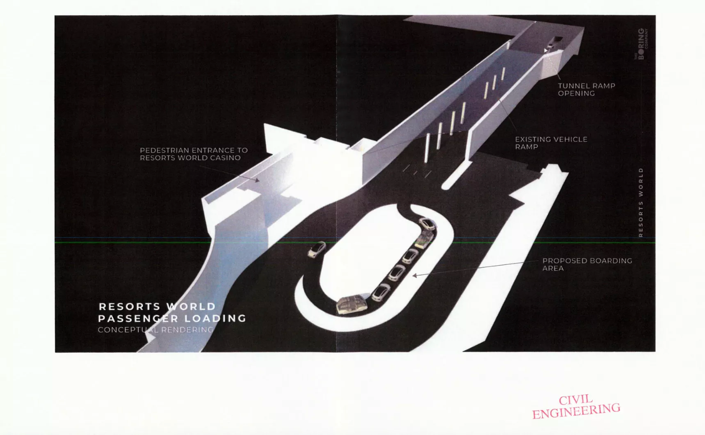 拉斯维加斯名胜世界和Boring则计划修建一条0.4英里长的隧道,从新建的酒店赌场延伸到LVCC扩建工程中正在修建的一个停车场。两端的乘客站台也将设在地面上。
