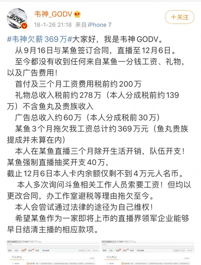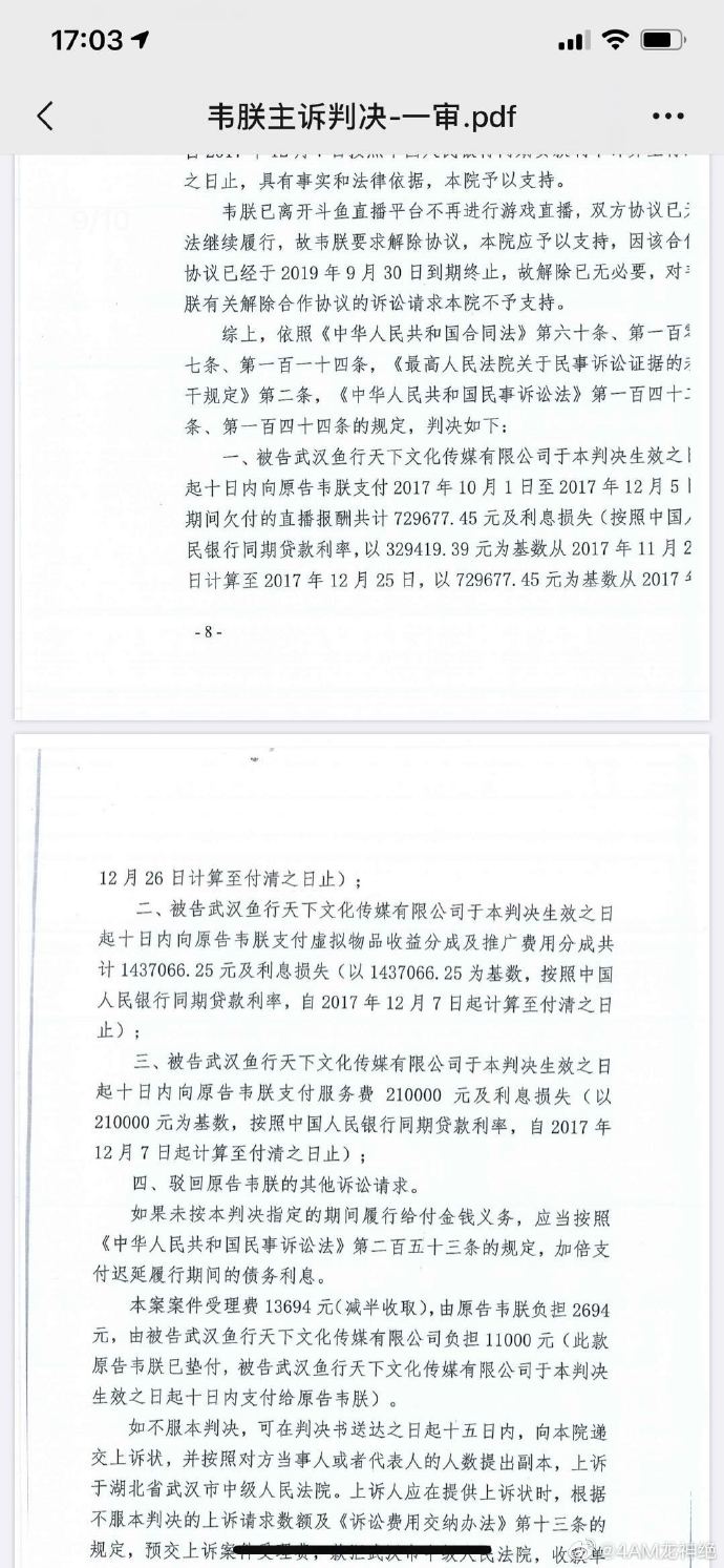 今年4月26日,4AM俱乐部经理@4AM龙神绝在微博发布韦朕主诉斗鱼的判决书,判决结果称斗鱼需要向韦朕支付其2017年10月1日至2017年12月5日期间欠的的直播报酬共计729677.45及利息损失,以及韦朕直播间从2017年9月来的虚拟礼物收益1437066.25元及利息损失,服务费210000元及利息损失。