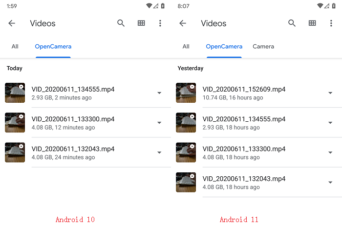(左为 Android 10,右为 Android 11)