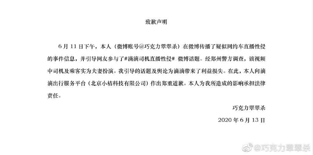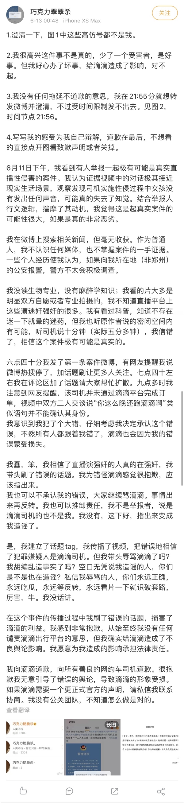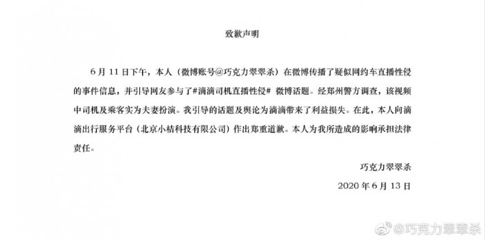 文中,@巧克力翠翠杀表示,“我向滴滴道歉,向所有善良的网约车司机道歉。很抱歉我无意引导了错误的舆论,导致滴滴的形象受损。”“如果滴滴需要一个更正式官方的声明,请私信我联系协商。”