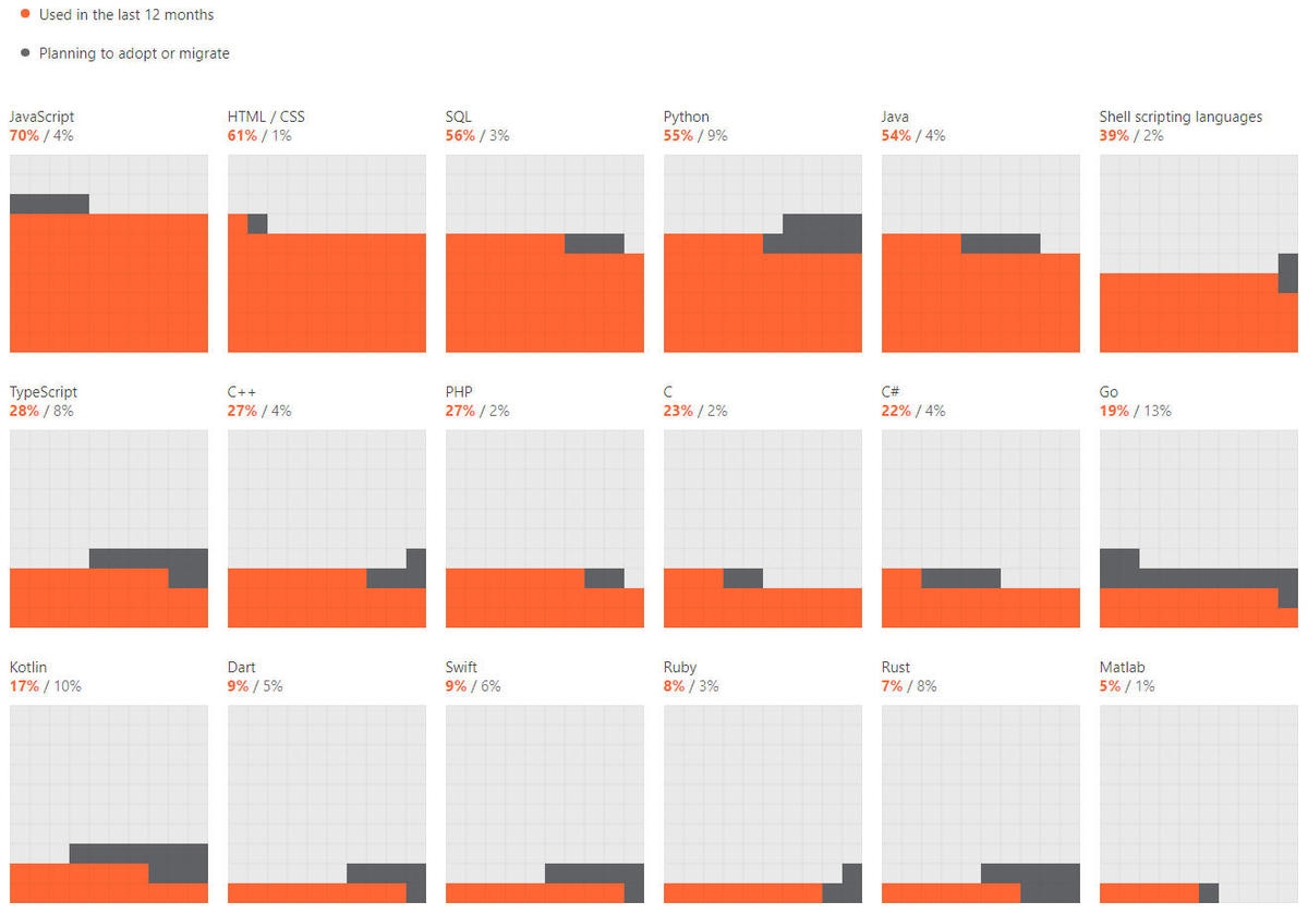 最后是对于新语言的兴趣,Go、Kotlin、Rust、TypeScript、Swift、Dart等在列。