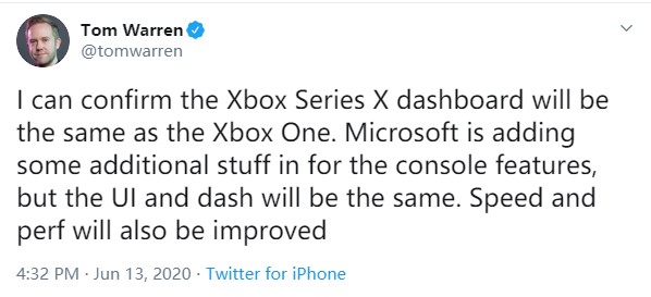 外媒The Verge知名编辑Tom Warrren通过推特表示,Xbox Series X的用户界面和Xbox One相同,但微软正在为新主机添加一些额外的功能。根据其推特内容,他确认两款主机用户界面相同,除了会为新主机添加额外功能外,Xbox Series X的速度和性能也会得到提升。