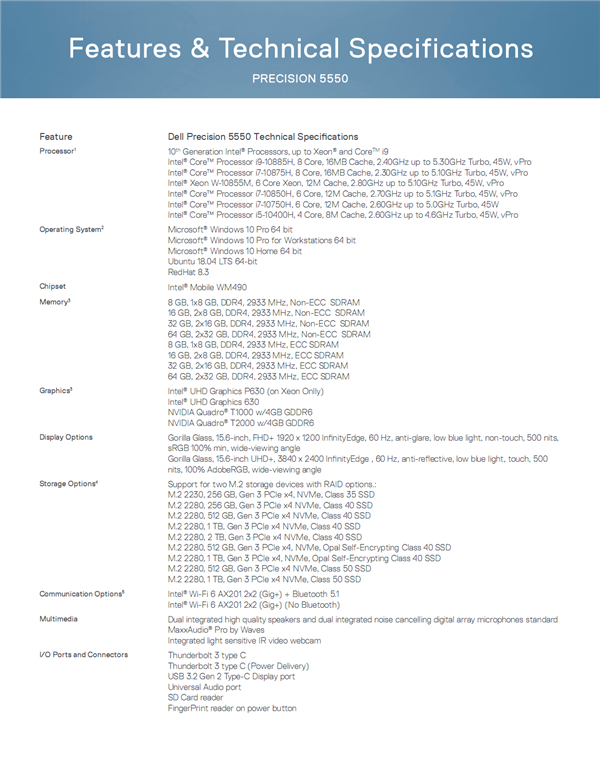 Precision 3550型号看只差“1”,但改用了Comet Lake-U十代酷睿U系列低压版,最高i7-10810U 6核心12线程,内存频率降至2666MHz,仅支持单个硬盘(2.5寸或M.2),电池最大四芯68Whr,重量1.86公斤,厚度14.99毫米,其他基本同3551。