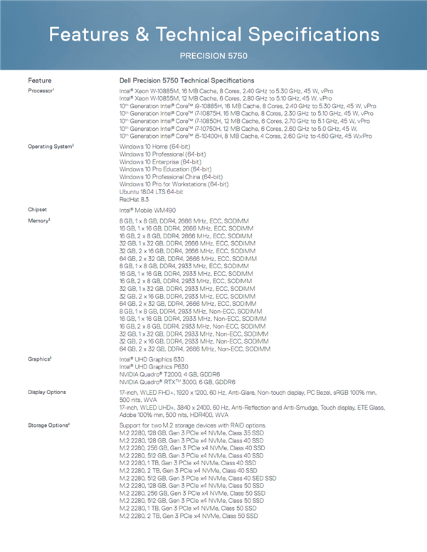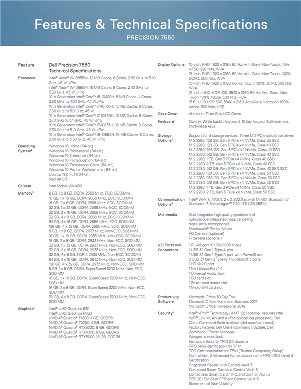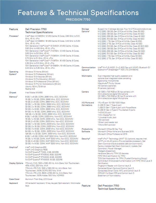 处理器可选十代酷睿H系列(最高i9-10885H)、至强W-10885M/10855M,最多8核心16线程,最高频率5.3GHz;内存从单条8GB 2666MHz直到四条32GB 2933MHz或者四条8GB 3200MHz,可选ECC;硬盘支持四块M.2 2280,PCIe 3.0 x4,单块最大2TB;显卡除了核显UHD 630/P630,还可选Quadro T1000、RTX 3000/4000/5000;网络标配Intel千兆有线网卡、AX201 Wi-Fi 6无线网卡,可选骁龙X20 4G基带。