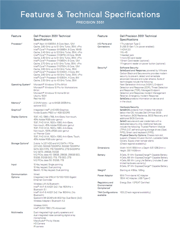 处理器取消了W-10855M,其他同上;内存两条DDR4-2633,最大64GB,可选ECC;硬盘一个2.5英寸和一个M.2 SATA/PCIe,最大容量均为2TB;显卡除了核显还有Quadro P620;网络有Intel I219LM千兆网卡、AX201 Wi-Fi 6或高通QCA61x4A Wi-Fi 5无线网卡;接口有一个雷电3、三个USB 3.0(其一快充)、一个HDMI 2.0、一个microSD,可选智能卡、指纹识别电源键;三芯51Whr/四芯68Whr快充电池,或者四芯68Whr/六芯97Whr长寿电池。