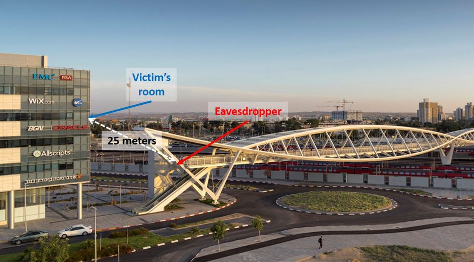 与分析声波对附近物体影响的类似攻击不同,这个版本是被动地、从外部的,而且最关键的是能实时开展。为了证明攻击的有效性,团队目标地点是一幢写字楼三楼的办公室。幕墙可以减少办公室发出的光线,覆盖了整个建筑。目标办公室包含一个悬挂的E27 LED灯泡(12瓦)。