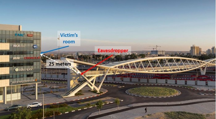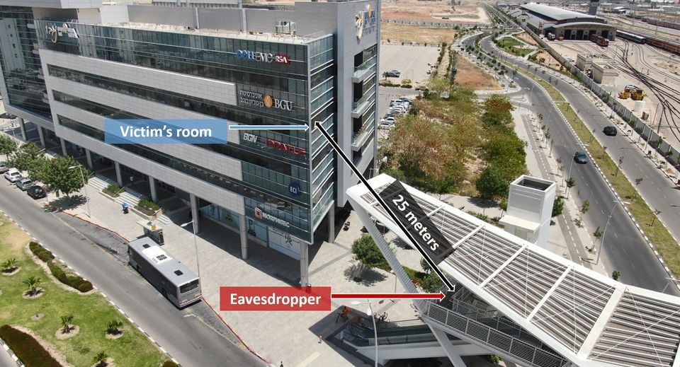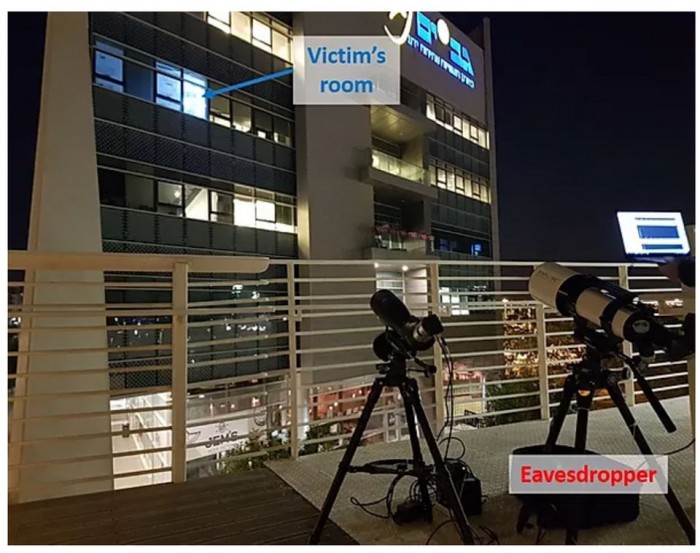 窃听者位于一座人行天桥上,定位在距离目标办公室25米的空中距离。本部分描述的实验是使用三个不同透镜直径(10,20,35 cm)的望远镜进行的。