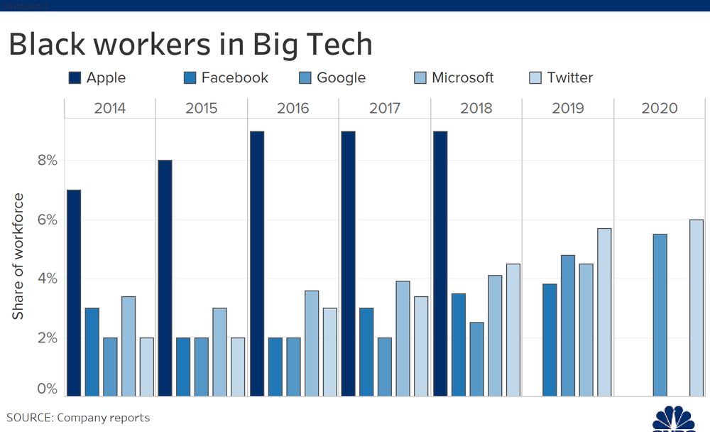2014年,多家科技公司承认了种族差距,并将增加员工多样性作为一个公共目标。而最近几周,各大科技公司的首席执行官再次宣誓要解决不平等问题。原因是明尼阿波利斯市一名白人警察在乔治·弗洛伊德(George Floyd)的脖子上跪了九分钟,手无寸铁的黑人被杀害了,此事引发了公众的愤怒。连续几周,美国各地城市都爆发了抗议活动。