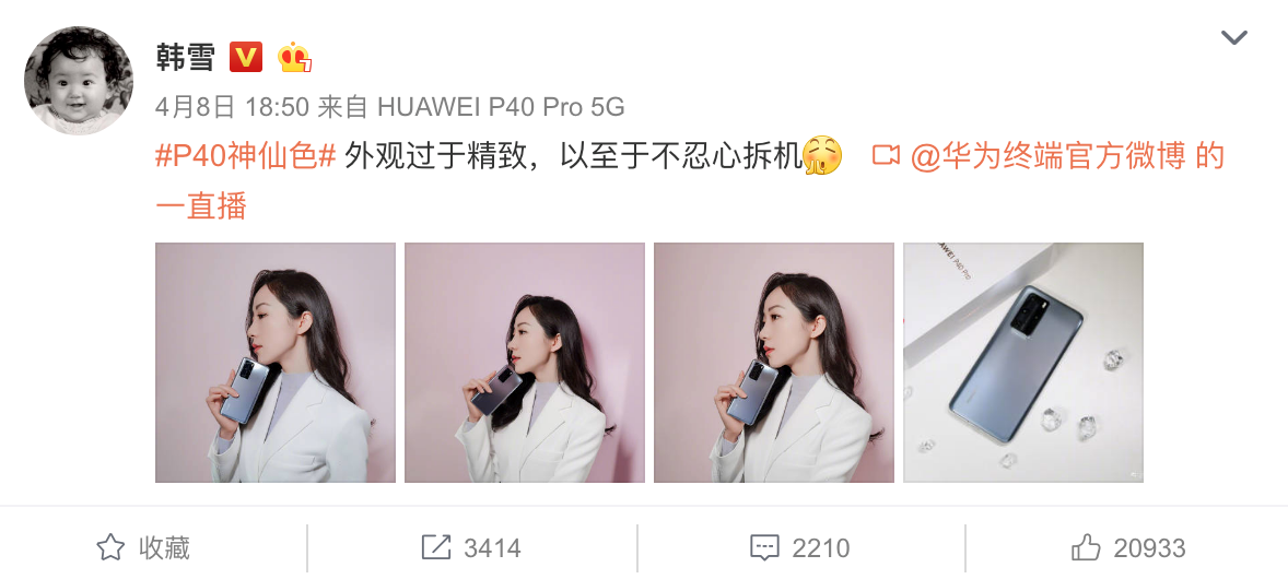 不仅普通人,连时尚前沿的女明星们也非常喜欢华为P40系列,像韩雪、陈数等等都在它一开卖就快速在微博上晒出了自己的华为P40 Pro新机。