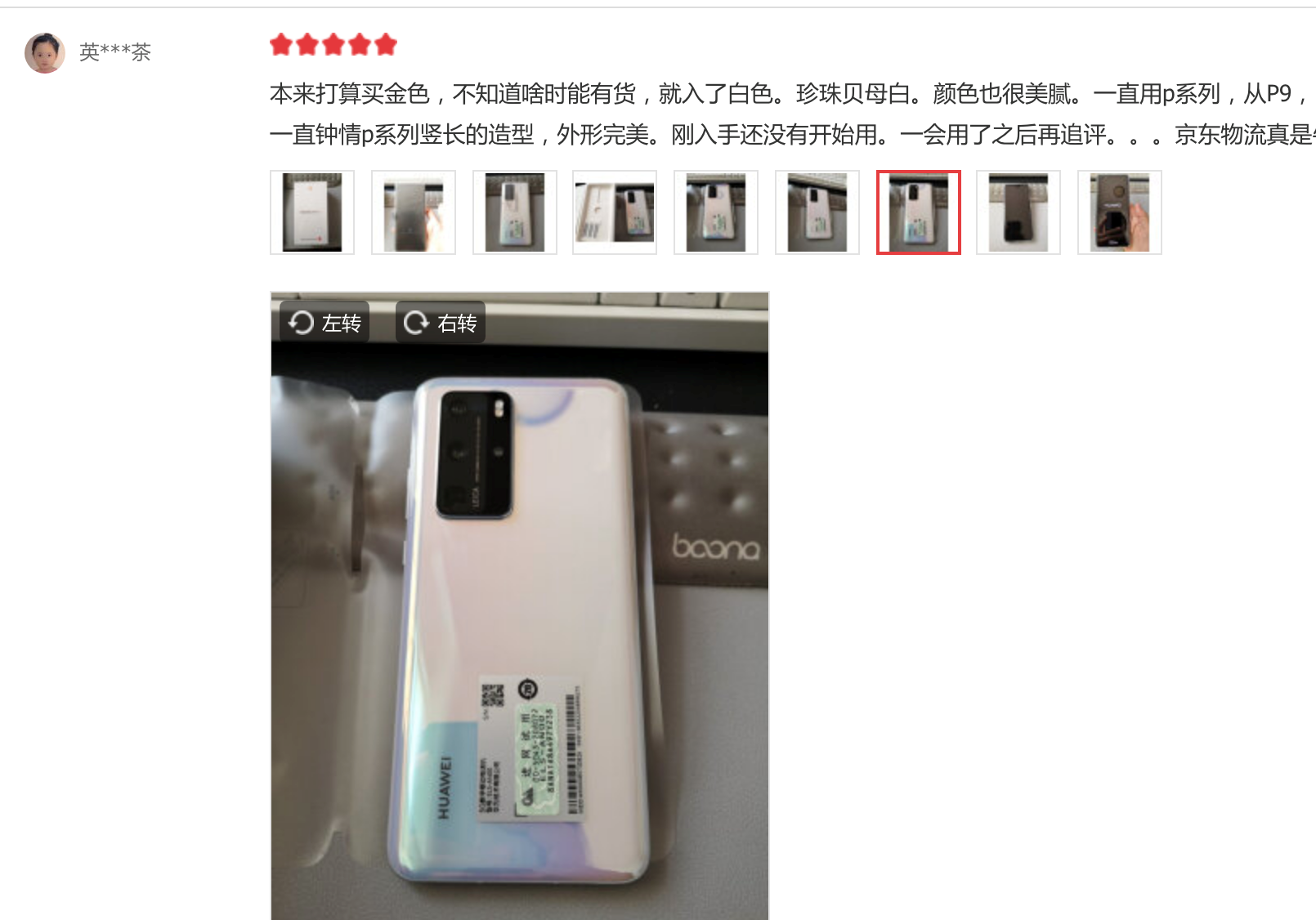 还有这位女粉丝如此评价P40系列的外观:“买不到想要的金色(晨曦金),就选了珍珠贝母白(零度白),颜色美腻……一直钟情P系列竖长的造型,外形完美。”