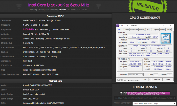 Intel的十代酷睿桌面版处理器发布有段时间了,虽然14nm++工艺、Coffee Lake架构没变,但酷睿i9-10900K依然做到了10核20线程、5.3GHz频率,也因此成为发烧玩家、超频玩家的新宠。正当大家都在挑选大雕体质的酷睿i9-10900K处理器时,丹麦超频玩家Afrom1选择了酷睿i7-10700K作为突破,这是一款8核16线程、加速频率5.1GHz的处理器,Afrom1一举将它超频到了6.2GHz,而且没上液氮。